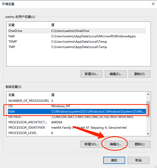 4、在环境变量对话框中 点击系统变量(S) 中的 Path,然后点击编辑(I)...进入编辑环境变量对话框。