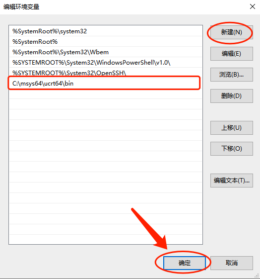 5、在 编辑环境变量对话框,右键点击新建(N),然后粘帖复制的路径 C:\msys64\ucrt64\bin,点击确定完成编辑,之后依次点击确定关闭所有的对话框。