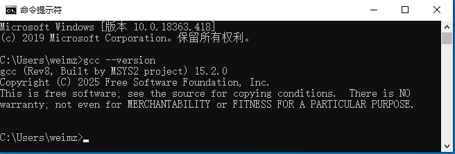 这说明已经成功安装了 gcc,当前 gcc 的版本号是 15.2.0。