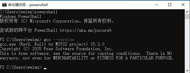 8、 输入 powershell 命令进入 Power Shell ,然后继续查看 gcc 编译器是否可用,正常显示如下: